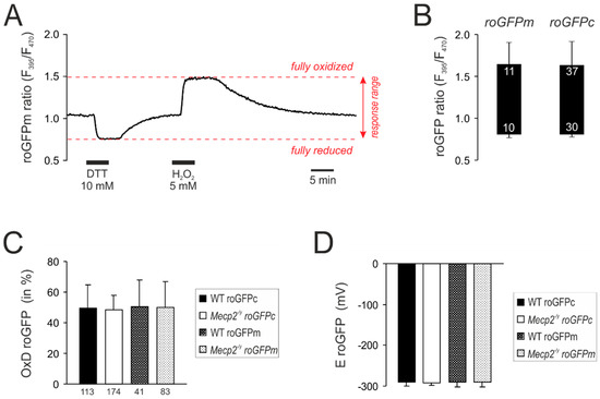 Calibration of the response ranges of roGFPc and roGFPm. (A) Calibration experiment performed for roGFPm. Reduction of roGFPm decreases the fluorescence ratio (F395/F470), whereas oxidation corresponds to an increased ratio. Maximum reduction and oxidation of roGFPm was evoked by DTT and H2O2, respectively. Ideally, both treatments are to be recorded in the same cell, also alternating the order of treatments among cells. (B) Box plot of the determined responses ranges. The ceiling of each box identifies the maximally oxidized roGFP ratio; the floor indicates the maximally reduced state. Error bars represent standard deviations of the ratiometric values. Response ranges were identical for cytosol-expressed (roGFPc) and mitochondria-targeted roGFP (roGFPm). Numerical figures in the box indicate how many calibrations were performed. They slightly differ for full oxidation and reduction, as not each cell undergoing maximum oxidation as a first treatment fully recovered and therefore did not undergo the following reducing treatment. (C) Steady state resting baseline conditions determined in cytosol and mitochondrial matrix of WT and Mecp2−/y neurons. Plotted is the relative degree of roGFP oxidation, as calculated from the calibration parameters (see Equation (1)). The number of cells analyzed is indicated below each bar. (D) Summary of the roGFP reduction potentials calculated for the different cell compartments and genotypes (see Equation (2)).