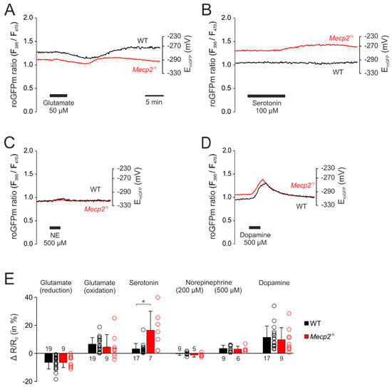 Neurotransmitter stimulation mediated only moderate redox-responses in mitochondrial matrices. (A) Glutamate also induced biphasic redox-responses in the mitochondria. The initial reducing shift and the secondary oxidation of roGFPm did, however, not differ among genotypes. (B) Serotonin mediated a moderate oxidation of roGFPm, which was clearly more intense in Mecp2−/y than in WT neurons. (C) Norepinephrine evoked only a very moderate oxidation of roGFPm, which was identical in both genotypes. (D) Dopamine mediated comparable oxidizing shifts in the mitochondrial matrix of WT and Mecp2−/y neurons. (E) Summarizing bar plot of neurotransmitter-evoked changes in mitochondrial redox balance. (* p < 0.05; Mann–Whitney rank sum test). Plotted are the normalized changes in the roGFP ratio (ΔR/Ro), and the dot-plots signify the scatter of the underlying data.