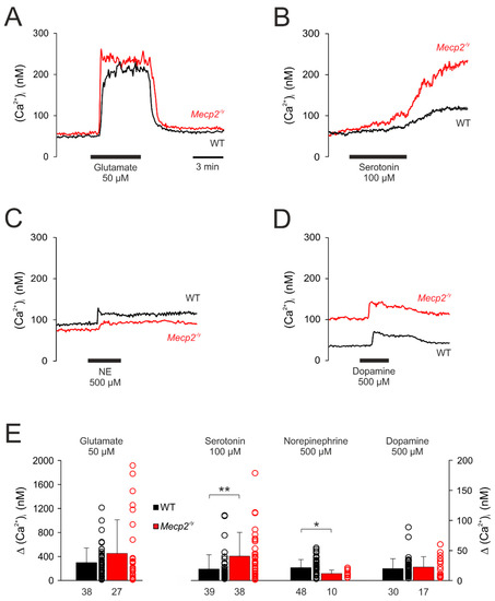 Dopamine (500 µM, 3 min) also elicited only moderate increases in (Ca2+)i. They fully recovered to baseline conditions and did not differ among genotypes (WT: 19.7 ± 16.5 nM, n = 30; Mecp2−/y: 22.3 ± 17.5 nM, n = 17) (Figure 5D,E).