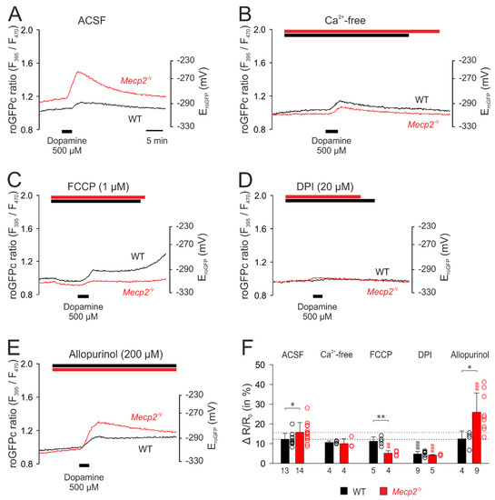 Upon withdrawal of extracellular Ca2+ (nominally Ca2+-free solutions), noticeable changes in the cytosolic redox baselines were not evident. The subsequent application of dopamine evoked an oxidizing response (Figure 6B), as seen in control solutions (Figure 6A), but its magnitude tended to become reduced only in Mecp2−/y neurons to 10.0 ± 2.5% (p = 0.103, n = 4; Figure 6B,F). Mitochondrial uncoupling by FCCP (1 µM) induced a moderate reducing shift in both WT and Mecp2−/y neurons, indicating that functional mitochondria constantly release small amounts of oxidants into the cytosol. Under these conditions, dopamine elicited unaltered roGFPc responses in WT neurons, whereas a markedly diminished oxidizing response was seen in Mecp2−/y neurons (5.1 ± 1.3%, n = 4; Figure 6C,F). Inhibition of NADPH oxidase by DPI (20 µM) did not evoke noticeable cytosolic baseline changes, but it almost abolished the dopamine-mediated oxidation of roGFPc in both genotypes (Figure 6D,F). Blocking xanthine oxidase by allopurinol (200 µM) did not noticeably affect the baseline redox balance of WT and Mecp2−/y neurons either. In WT neurons, the dopamine-mediated oxidizing response remained unchanged, but in Mecp2−/y neurons it was markedly potentiated, now measuring 25.9 ± 9.8% (n = 9; Figure 6E,F).
