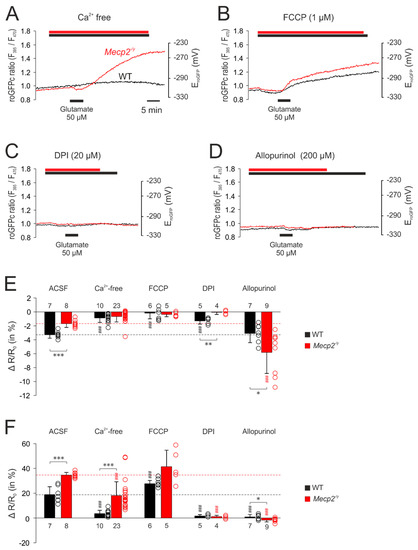 The corresponding set of treatments was then performed with glutamate-mediated stimulation. Withdrawing extracellular Ca2+ almost completely abolished the glutamate-mediated responses in WT neurons. The initial reducing shift was almost absent, and the secondary oxidizing shift was markedly depressed. In Mecp2−/y neurons, the dampening effects were less pronounced. The initial reducing shift was similar to WT neurons, but the secondary oxidizing response—despite a ~48% depression, was still more intense than in WT neurons (Figure 7A,E,F). Upon mitochondrial uncoupling (1 µM FCCP), glutamate no longer evoked a noticeable initial reducing shift, but immediately elicited a pronounced cytosolic oxidation, which tended to be more intense in Mecp2−/y (41.4 ± 13.3%, n = 5) than in WT neurons (27.7 ± 2.7%; n = 6, p = 0.082). It also tended to be higher than the cytosolic oxidation observed in control solution (Figure 7B,F). Inhibition of NADPH oxidase by DPI (20 µM) almost completely abolished the responses to glutamate in both genotypes (Figure 7C,F). As shown in the summarizing bar plots, only in WT neurons, part of the initial reducing shift persisted (Figure 7E). Blockade of xanthine oxidase by allopurinol (200 µM) also almost completely abolished the glutamate-mediated oxidizing responses in the cytosol of WT and Mecp2−/y neurons. Instead, only the initial moderate reducing shift remained, and it became prolonged and was intensified especially in Mecp2−/y neurons (Figure 7D–F).
