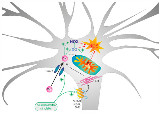 By pharmacological intervention, withdrawal of extracellular Ca2+, as well as ratiometric Fura-2 imaging, we identified the mechanisms contributing to the transmitter-mediated cytosolic redox alterations. Moderate Ca2+ rises stimulate mitochondrial metabolism. As the ROS generation of mitochondria correlates with their metabolic rate, this metabolic stimulation may reflect part of the observed cytosolic and mitochondrial oxidizing responses [82]. Excessive cellular Ca2+ loads may, however, provoke mitochondrial dysfunction and the production of high amounts of ROS [82,83]. Glutamate mediated the most intense cytosolic Ca2+ increases, which—based on time-course and magnitude—represent Ca2+-influx from extracellular space. Serotonin, norepinephrine and dopamine evoked markedly less intense cytosolic Ca2+ transients by releasing Ca2+ from intracellular stores. This clearly heterogeneous nature of the recorded Ca2+ transients argues against Ca2+ being the sole cause of the transmitter-evoked oxidizing redox responses, which is confirmed by the experiments in Ca2+ free solutions.