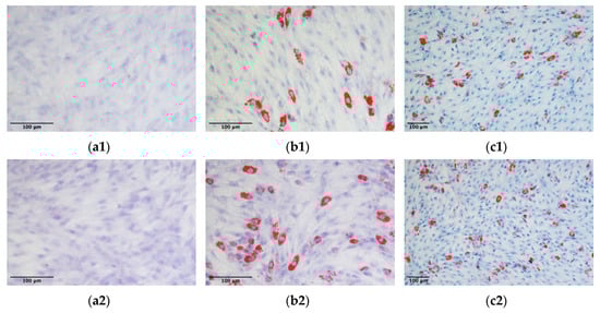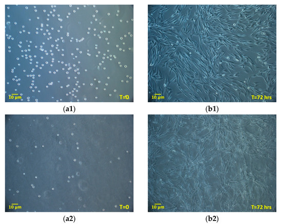 Morphology of adipose tissue derived mesenchymal stem cells (ADMSCs) cultured on plastic surface (a1, b1; 100×) or embedded in the 3D fibrin-based matrix (a2, b2; 100×). When seeded on plastic surface ADMSCs take on the classic fibroblast-like shape (b1, 72 h). When maintained inside the 3D matrix, cells are dispersed homogeneously and exhibit a thinner spindle-like morphology (b2, 72 h).