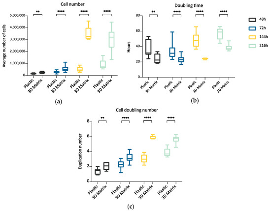 Box plot illustrating differences in average cell number (a), cell doubling time (b), and cell doubling number (c) obtained from cells maintained on plastic surface or inside a 3D matrix prepared from PPP, at different time points (48, 72, 144, 216 h) (n = 5). Statistically significant differences are indicated as follows: ** p ≤ 0.01, **** p ≤ 0.0001.