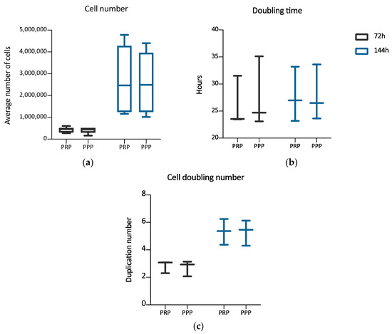 Box plot illustrating differences in average cell number (a), cell doubling time (b), and cell doubling number (c) of cells maintained inside a 3D matrix prepared from PRP or PPP, at different time points (72, 144 h) (n = 3). No statistically significant differences are observed between the two culture conditions.