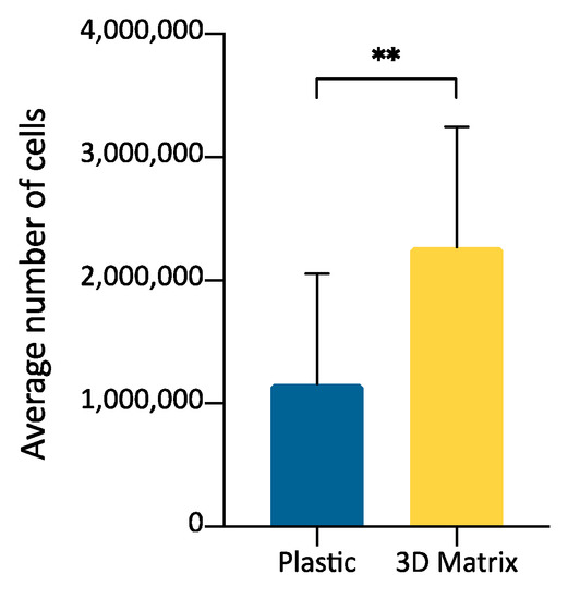 Graph bars representing the average number of cells obtained from adipose tissue derived SVF cells expanded on plastic surface or inside a 3D matrix prepared from PPP (n = 3). Statistically significant differences are indicated as follows: ** p ≤ 0.01.