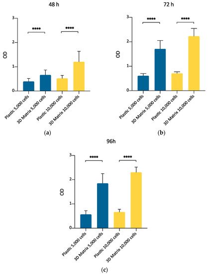 MTT assay: the same experimental set-up was repeated in 96-well plates and cell growth was assessed by MTT assay (see Figure A3). For this purpose, 5 × 103 or 10 × 103 cells were seeded in each well and cultured on plastic surface or inside the 3D matrix in a final volume of 150 µL. After 48, 72, or 96 h, 50 µL of medium were removed from each well and 20 µL of a 5 mg/mL solution of MTT in phosphate-buffered saline (PBS), pH 7.4 were added. After 4 h, formazan salts were solubilized adding 100 µL of 10% SDS in 0.01 M HCl. Formazan absorbance was recorded after overnight incubation at 570 nm by a Victor reade spectrophotometer (Perkin Elmer, Groningen, Netherland). Each experiment was repeated five times, and for each experiment 6 replicates were prepared.