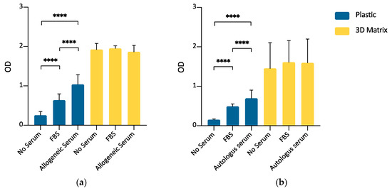The experiment aimed to assess if autologous serum can be used as FBS substitute in the expansion of ADMSCs. The use of autologous blood-derived products avoids the risks associated with a xenobiotic supplement (FBS) and increases the safety of the cell preparation, avoiding the risk of the transmission of infectious diseases. Canine ADMSCs were expanded in medium supplemented with 10% autologous serum or FBS. Autologous serum could replace FBS, both for 2D and 3D cultures. A statistically significant increase of the signal was observed in this set of experiments for the cells cultured in autologous serum (Figure 8b, p < 0.0001) but only on the plastic surface.