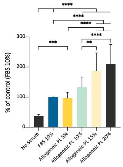 Effects of different percentages of allogeneic PL medium supplementation for the culture of ADMSCs on plastic surface, MTT assay (5000 cells/well; 72 h). Allogeneic PL represents an effective stimulus for cell growth, substituting 10% FBS medium supplementation. Statistically significant differences are indicated as follows: ** p ≤ 0.01, *** p ≤ 0.001, **** p ≤ 0.0001 (n = 3).