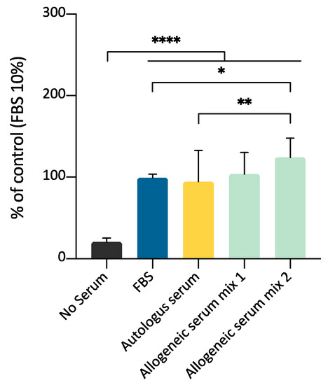 Comparison between allogeneic serum, autologous serum, and FBS as medium supplements for ADMSCs growth, by MTT assay (5000 cells/well; 10% supplementation; 72 h). Both autologous serum and allogeneic serum mix supplementation can substitute FBS for ADMSCs culture. Statistically significant differences are indicated as follows: * p ≤ 0.05, ** p ≤ 0.01, **** p ≤ 0.0001.