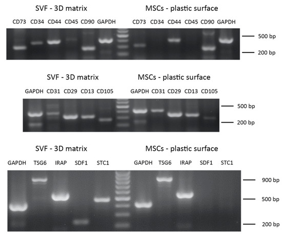 To compare the phenotype of ADMSCs grown on a plastic surface and inside the 3D fibrin scaffold, and to characterize SVF cells grown inside the 3D scaffold, a panel of markers has been analyzed by semi-quantitative RT-PCR. Both ADMSCs populations expressed CD29, CD90, CD73, CD44, CD13, CD31, and CD105. The cells were negative for CD45. CD34 was expressed only by ADMSCs grown in the 3D environment. A similar pattern was observed for SVF cells, although they showed a faint expression of CD45, as already reported for this heterogeneous cell population that contains, for example, CD45+ macrophages [15]. SVF cells also expressed CD34. CD34 expression in ADMSCs is a matter of investigation and discussion by the scientific literature. Although CD34 gene is expressed by hematopoietic progenitors and endothelial cells, and is not usually expressed in MSCs, different authors report its expression in ADMSCs in several animal species [32,43]. Dykstra et al. suggest that its expression in MSCs can be lost as a consequence of in vitro culture [43]. As a matter of fact, in our cultures, CD34 was expressed only in cells grown within the 3D fibrin scaffold, and its expression could reflect a cell response to different environmental cues. Moreover, CD34 expression in SVF cells has already been reported, because of the presence of macrophages, endothelial precursor cells, and pre-adipocytes [15]. Furthermore, we analyzed the expression of markers that, although not essential to determine the phenotype of MSCs, are related to their biological activity [47]. Interestingly, ADMSCs expressed in both environmental conditions TSG-6 and IRAP. Both TSG-6 and IRAP although using different pathways, contribute to the anti-inflammatory and immunomodulating activity of [48,49]. Furthermore, SVF expressed SDF-1 and STC-1 when maintained in 3D environment. SDF-1 is a key player in the recruitment of MSCs and other progenitor cells in damaged tissues [50]. STC-1 has a protective role against reactive oxygen species (ROS) and a potential anti-inflammatory action [51]. Altogether, these data support the use of the 3D environment to maintain key biological features of canine ADMSCs as suggested by others for human MSCs [48].