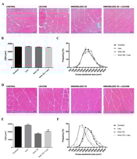Morphometric analysis after 3 and 7 days of immobilization and leucine supplementation. (A) Representative hematoxylin–eosin staining (HE) photomicrographs in soleus muscle after 3 days of immobilization (n = 4, scale bar 50 µm). (B) Soleus muscle average fiber cross-sectional area (CSA) and (C) distribution from control, leucine supplemented, immobilized, and immobilized supplemented with leucine after 3 days (n = 4). (D) Representative HE photomicrographs in soleus muscle after 7 days of immobilization (n = 5, scale bar 50 µm). (E) Soleus muscle average fiber CSA and (F) distribution from control, leucine supplemented, immobilized, and immobilized supplemented with leucine after 7 days (n = 5). Data were expressed as mean ± SD. Statistical analysis included Kruskal-Wallis test of one-way ANOVA followed by Dunn’s posthoc test. Two independent experiments were performed. * p < 0.05 vs. Control group; # p < 0.05 vs. Immobilized 7 d group.