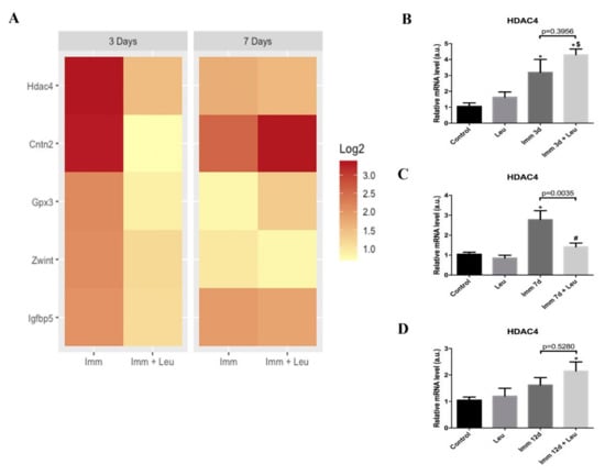 Genes responsive to hindlimb immobilization downregulated by leucine supplementation and HDAC4 validation at 3, 7 and 12 days. (A) Heat maps showing top differentially expressed genes strongly upregulated at 3 days of hindlimb immobilization that were softened by leucine supplementation; the 7-day timepoint is shown as time reference (n = 2 per group). (B) HDAC4 mRNA levels were determined by real-time PCR at 3 days (n = 6), (C) 7 days (n = 8) (D) and 12 days (n = 4) after immobilization (two independent experiments were performed for 3 and 7 days, and one independent experiment was performed for 12 days). Cyclophilin A expression was used as housekeeping gene. Data are expressed as mean ± SEM. Statistical analysis included one-way ANOVA followed by Tukey’s posthoc test. * p < 0.05 vs. control group; # p < 0.05 vs. immobilized 7 d group; $ p < 0.05 vs. leucine group.