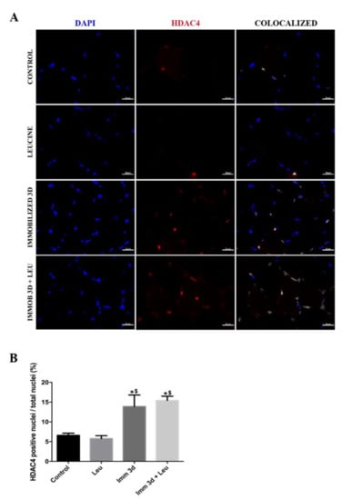 3.5. Leucine Reduces the Percentage of HDAC4 Positive Nuclei Accumulation Induced by Immobilization