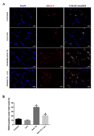 HDAC4 colocalization analysis after 7 days of immobilization and leucine supplementation. (A) Representative immunofluorescence photomicrographs of HDAC4 in soleus muscle after 7 days of immobilization, HDAC4 (red), DAPI (blue, used for nuclei identification), and colocalized (white) scale bar 20 µm. Less intense puncta reflect nuclei identified at either different focal planes or nuclei that were cut close at the edge. (B) Number of HDAC4 positive nuclei per total nuclei (%) (n = 5 per group, two independent experiments were performed). Data are expressed as mean ± SEM. Statistical analysis included one-way ANOVA followed by Tukey’s posthoc test. * p < 0.05 vs. control group; # p < 0.05 vs. immobilized 7 d group.