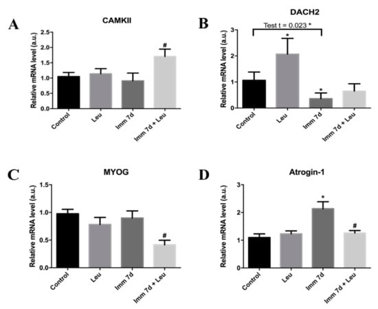 We observed that DACH2 mRNA levels were elevated by leucine supplementation alone (~2 fold), and only hindlimb immobilization caused a decrease in its mRNA levels (0.5 fold, significant in Student’s t-test). Leucine supplementation was not able to soften the DACH2 downregulation induced by immobilization at this timepoint (Figure 6).
