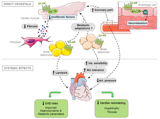 Finally, in addition to the fine-tuning of myocyte excitation–contraction coupling, β3-AR modulates cardiac function by directly regulating human coronary arteries relaxation [3], but also vascular systemic endothelial function [2,20,38], mainly—but not exclusively—through NOS/NO dependent mechanisms. Paracrine effects of β3-AR signaling from endothelial cells, but also to cardiac fibroblast [26] and from perivascular/epicardial adipose tissues are emerging as targets of interest for cardiac regulation and remodeling (see Section 4 and Section 5).