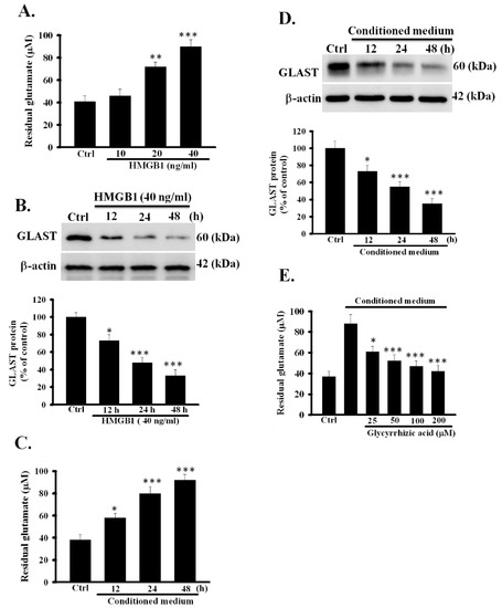 3.3. Exogeneous Recombinant HMGB1 Inhibited the Activity of Glutamate Clearance in Primary Astrocytes