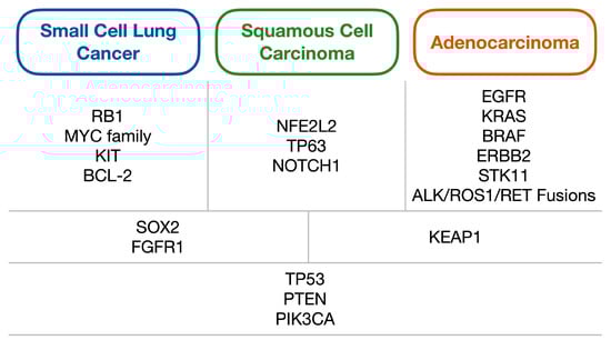 Diagram of the common genetic alterations found within lung carcinomas, split into alterations generally associated with either small cell lung cancer, squamous cell carcinoma or adenocarcinoma (first row); those commonly shared between two of the three subtypes (second row); and alterations shared between all three (third row). Adapted from Pietanza and Ladanyi (2012) [21].
