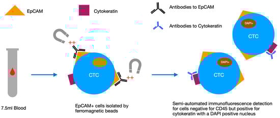 CTCs have been known to exist in the blood of cancer patients since the 19th century when they were first described by Ashworth [37]. Little research was carried out on these cells initially due to their comparative rarity in the blood, however, in the last few decades, advanced methods of isolation have permitted more detailed analysis and elucidation of CTCs. One of the more popular detection methods is the CellSearch® system (Menarini-Silicon Biosystems). In this system, a 7.5 mL blood sample is enriched for epithelial cells using ferromagnetic beads coated in epithelial cell adhesion (EpCAM) antibodies, before then removing non-cancerous cells (including white blood cells) by detecting for oval-shaped cells positive for cytokeratin, containing a DAPI positive nucleus but negative for CD45 (Figure 2) [38]. Validation studies have shown that CTCs detected via this method are rare in healthy controls and vary depending on the cancer type and stage [38]. The CellSearch® system is among the most commonly used CTC detection technologies, however other systems have been developed including CTC-iChip, EPISPOT and ISET among others [39,40,41,42]. Of these, ISET benefits from being less specific for epithelial-derived cells and therefore can isolate non-epithelial circulating cells [43].