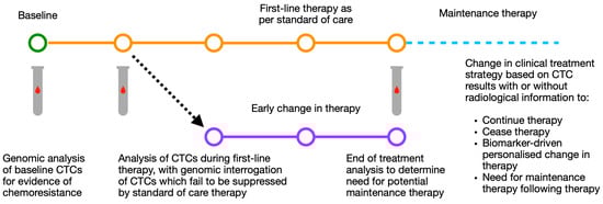 While the change of treatment based on CTC numbers in the blood may be of benefit, it would be of greater value to use these CTCs to evaluate specifically where future treatment should be directed. Indeed, if baseline CTCs could provide possible individualised treatment options, or if CTCs which failed to respond to first-line treatment (and therefore represent the subclone of disease responsible for treatment failure) could be interrogated for biomarkers or treatment efficacy, this could have a meaningful impact on clinical care (Figure 3).