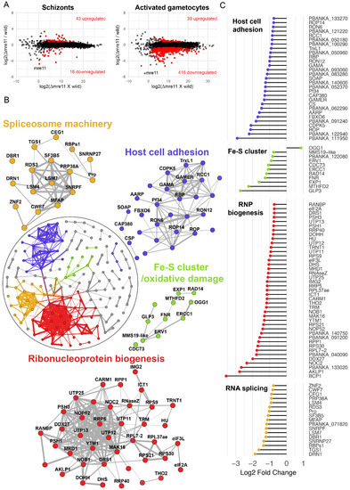To understand better the effect of mre11 deletion on the transcriptional footprint of genes across various biological processes, we compared the transcriptomes of Δmre11 and WT-GFP parasites by performing RNA-seq on schizonts and a mixture of activated male and female gametocytes. mre11 transcripts were significantly lowered at both stages in the mutant (by more than 16-fold) compared to those of WT-GFP controls (Figure 4A), thus confirming loss of mre11 expression in the knockout parasites. In the asexual blood-stage schizonts, there was no major perturbation of global gene expression resulting from mre11 deletion, as deduced by comparing the Δmre11 and WT-GFP profiles (Figure 4A and Supplementary Materials Table S1), which differed only in changes in a small number of genes that mostly belong to highly variable subtelomeric multigene families. In contrast, there was significant transcriptional dysregulation in activated gametocytes with 418 transcripts (representing 8% of all genes) downregulated in Δmre11 parasites (Figure 4A and Supplementary Materials Table S1), several of which encode for ribosomal and associated proteins. To define biological signatures within the data, we matched the differentially expressed genes to protein–protein association networks in the STRING database [23], and identified major, interconnected gene clusters representing four biological processes: mitochondrial iron–sulfur cluster biogenesis and oxidative DNA damage, ribonucleoprotein (RNP) biogenesis, spliceosome machinery, and host-cell adhesion antigens (Figure 4B). Of note, downregulated genes involved in mitochondrial iron–sulfur cluster biogenesis and oxidative DNA damage included GLP3, the only glutaredoxin-like protein located in the mitochondrion [27], NADP-reductase [28], the mitochondrial FAD-linked sulfhydryl oxidase ERV1 [29], MMS19-like protein [30] and oxoguanine glycosylase 1 (OGG1) (Figure 4C). Genes essential for RNP biogenesis included those coding for the nuclear chaperone BCP1, the ATPase AKLP1 (an orthologue of hCINAP), nucleolar complex protein 2 (NOC2) and ribonuclease P Protein 1 (RPP1—depletion of which results in global defects in rRNA processing in Saccharomyces cerevisiae [31]). Spliceosome-associated genes included those for debranching enzyme 1 (DBR1) and DBR1 associated ribonuclease 1 (DRN1), microfibril-associated protein 1 (MFAP1) and the pre-mRNA-splicing factor CWF7. Finally, genes downregulated in Δmre11 gametocytes that are essential for host cell adhesion and parasite transmission in the mosquito included those for secreted ookinete adhesive protein (SOAP), GPI-anchored micronemal antigen (GAMA), gamete release protein (GAMER) and the oocyst markers CAP380 and circumsporozoite protein (CSP) (Figure 4C). Analysis of single-cell RNAseq data [24] showed that 85 out of the 99 genes in the four clusters have peak expression during the ookinete or the oocyst stages (Supplementary Materials Data file S1), with most of the genes also showing higher levels of transcription in female than male gametocytes (Supplementary Materials Figure S1A), further indicating female lineage expression for these genes.