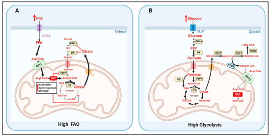 The key enzymes determining the competition of glycolysis versus mitochondrial fatty acid oxidation (FAO) defined by the Randle cycle. (A) Increased extracellular free fatty acids availability (FFA) can increase mitochondrial fatty acid oxidation (FAO), resulting in higher levels of acetyl-CoA, NADH, and ATP inside the mitochondria. As a result, citrate production by citrate synthase (CS) is increased, but the activity of PDH and TCA cycle dehydrogenases is decreased by the elevation in acetyl CoA/CoA, NADH/NAD+, and ATP/ADP ratios. Thus, FAO leads to an accumulation of mitochondrial citrate, which is exported to the cytosol via the CIC/SLC25A1 exporter. High citrate in the cytosol can inhibit phosphofructokinase-1 (PFK-1) and pyruvate kinase (PK) activities, decreasing glycolysis, pyruvate synthesis and oxidation. (B) When extracellular glucose increases, the concomitant upregulation in glycolysis provides more pyruvate to the mitochondria. Pyruvate oxidation by PDH and pyruvate carboxylation by pyruvate carboxylase (PC) generate acetyl-CoA and OAA respectively, increasing citrate synthase (CS) activity. The amount of citrate produced is higher that needed to sustain the carbon pool of TCA cycle intermediates, which causes its export to the cytosol. Under high glucose, cytosolic citrate is hydrolyzed by ATP-citrate lyase (ACLY) into acetyl-CoA and OAA. Acetyl-CoA is carboxylated by two acetyl-CoA carboxylases, ACC1 and ACC2, to generate malonyl-CoA. ACC2 is localized in the outer mitochondrial membrane, causing malonyl-CoA to be more accessible to carnitine-palmitoyl transferase 1 (CPT1). Malonyl-CoA inhibits CPT1 activity, the protein responsible for the entry of long chain fatty acids into mitochondria. ACC1 is cytosolic and can preferentially commit malonyl-CoA to the cytosolic enzyme fatty acid synthase (FASN), responsible for de novo fatty acid synthesis.