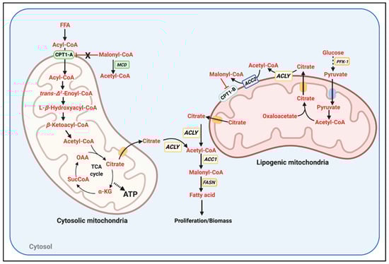 We propose that two segregated mitochondrial populations exist in cancer, lipogenic mitochondria, and cytosolic mitochondria (Figure 2). This segregated population of lipogenic mitochondria would be qualitatively equivalent to the peridroplet mitochondria that we published in BAT. Peridroplet mitochondria had a higher capacity to oxidize pyruvate, higher citrate synthase activity, and decreased capacity to execute FAO [54]. We propose that lipogenic mitochondria in cancer will preferentially associate with ACC2 and express CPT1-B. The combination of ACC2 and CPT1-B would allow glycolysis to effectively block FAO in lipogenic mitochondria, impeding the decreases in TCA and PDH activity induced by FAO. Then, the population of cytosolic mitochondria would be the one executing FAO, as cytosolic mitochondria would carry CPT1-A and would not associate with ACC2. Consequently, cytosolic mitochondria could not be exposed to inhibitory malonyl-CoA concentrations, as CPT1-A has an IC50 of 100 μM. These cytosolic mitochondria could associate with malonyl-CoA decarboxylase (MCD) when the glycolytic and lipogenic fluxes were high enough to generate malonyl-CoA at concentrations > 100 μM. An unaddressed aspect of this model is how the increase in citrate production by both cytosolic mitochondria and lipogenic-mitochondria is not blocking PFK1 activity. Another speculative hypothesis would be that ACLY could transiently associate with the outer mitochondrial membrane of lipogenic mitochondria (or even cytosolic mitochondria). In this way, citrate could be rapidly transformed to acetyl-CoA and OAA before having the opportunity to inhibit PFK1 and glycolysis. To our knowledge, ACLY has not been found to be associated with mitochondria. Thus, this is raising the exciting possibility that ACLY association to mitochondria is a specific requirement of non-Randle cycle abiding tumors.