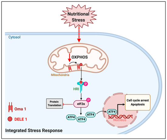 The effects of extracellular nutrients on mitochondria could activate the integrated stress response (ISR) pathway in cancer. Changes in extracellular nutrient availability can induce changes in mitochondrial function leading to decreased oxidative phosphorylation (OXPHOS), namely mitochondrial ATP synthesis fueled by respiration. A decrease in OXPHOS can activate the mitochondrial protease OMA1, which cleaves the mitochondrial protein DELE1. The short form of DELE 1 can be released to the cytosol, bind to the Heme-regulated inhibitor kinase (HRI) and activate its function. HRI phosphorylates the eukaryotic translation initiation factor 2a (eIF2 a), which inhibits protein translation, with the exception of the transcription factor ATF4. The actions of ATF4 in the nucleus execute the ISR to induce cell cycle arrest and even apoptosis.