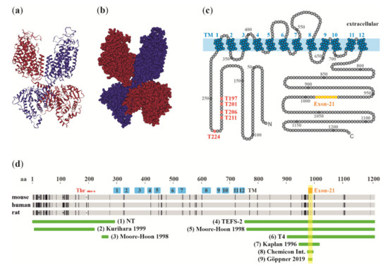 NKCC1 mediates a tightly coupled electroneutral uptake of Na+, K+, and Cl− ions with a stoichiometry of 1:1:2. The monomer, two of which are required for the dimeric functional transporter [19], consists of twelve transmembrane segments flanked by intracellular N-terminal and C-terminal domains [20,21,22]. Recently, single-particle electron cryo-microscopy has confirmed the predicted dimeric structure and allowed detailed exploration of functionally important secondary and tertiary structures, including the ion translocation pore, extracellular cap domain, and the surface residues forming the interface between dimer subunits [23,24] (Figure 1a–c).