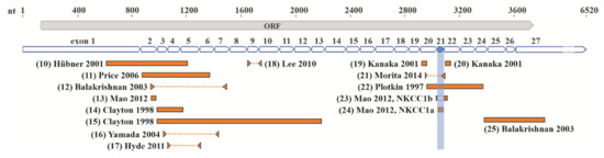 Regions of NKCC1 mRNA targeted in the expression studies. Regions of NKCC1 mRNA targeted by in situ probes (orange rectangles) or PCR amplification (orange dashed lines). Mouse NKCC1 nucleotide sequence NM_009194 is used as a reference sequence for mouse in situ probes and PCR fragments. For rat and human in situ probes and PCR fragments, the corresponding mouse nucleotide sequences are indicated. (10) Mouse in situ probe nt 615–1206 [68], (11) rat in situ probe nt 883–1376 [66], (12) rat PCR amplicon nt 938–1468 [69], (13) rat in situ probe nt 946–983 [65], (14, 15) rat in situ probes 988–1179 and nt 988–2190 of rat NKCC1 [70], (16) rat PCR fragment nt 1033–1435 amplified with single-cell RT-PCR [71], (17) exon 4 and 5 of human NKCC1 targeted with qRT-PCR [72], (18) rat amplicon nt 1650–1751 amplified by RT-PCR [73], (19, 20) rat in situ probes against nt 2925–2960 and nt 3099–3134 [74], (21) human PCR fragment nt 2950–3093 [75], (22) mouse in situ probe against nt 2951–3365 [38], (23, 24) rat NKCC1a and NKCC1b isoforms-specific in situ probes against nucleotides 3041–3073 and 3024–3040 + 3089–3103, respectively [65], (25) rat in situ probe against nt 3373–3814 rat NKCC1 [69]. Part of the 3’UTR encoded in exon 27 is omitted for clarity (dashed line).