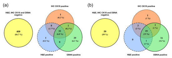 Comparison of examination results for the presence of tumor cells using the H&E, IHC CK19 and OSNA methods by Venn diagrams. (a) Groups of lymph nodes; (b) patients.