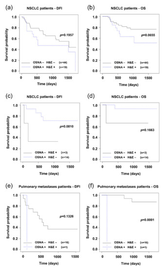The clinical significance of the presence of tumor cells in lymph nodes determined by the H&E and OSNA methods was evaluated by analyzing the relation to DFI and OS. The Kaplan–Meier curves comparing NSCLC patients with positive and negative LNs detected concordantly by the H&E and OSNA methods are provided in Figure 2a,b. Survival analysis of patients with pulmonary metastases concordantly analyzed by both methods is shown in Figure 2e,f. The Kaplan–Meier curves show that patients with positive LNs have a shorter OS.