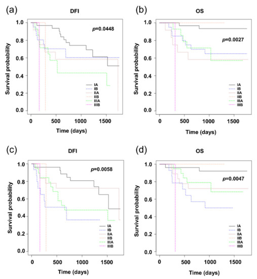 Kaplan–Meier survival distribution functions of NSCLC patients stratified according to stage of disease. (a) Disease-free survival (DFI) of patients classified according to the results of H&E; (b) overall survival (OS) of patients classified according to the results of H&E; (c) disease-free survival (DFI) of patients classified according to the results of OSNA; (d) overall survival (OS) of patients classified according to the results of OSNA.