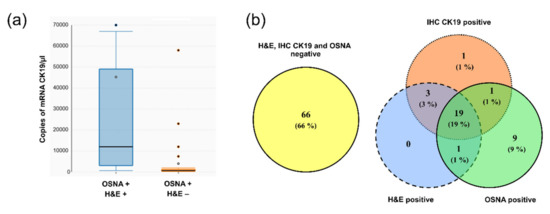 Data supporting new cut-off value. (a) Box plots showing copy number of mRNA CK19. Groups of lymph nodes, positive based on both OSNA and H&E methods (OSNA + H&E +), have significantly higher copies of mRNA CK19 than those positive by the OSNA method but negative by H&E (OSNA + H&E −); (b) comparison of examination results of patients for the presence of tumor cells using the H&E, IHC CK19 and OSNA methods by Venn diagrams using the new cut-off value of the OSNA method 615 copies of mRNA CK19/µL.