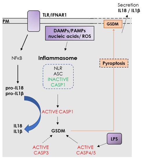 The inflammasome is activated by different DAMPs or pathogen-associated molecular pattern (PAMPs). It is a multiprotein complex that, like the apoptosome (intrinsic apoptosis) or the DISC (extrinsic apoptosis), acts as a caspase-activating platform. It is formed by a receptor (NOD-like receptor (NLR) family or non-NLR (AIM2)), an adapter protein (ASC, apoptosis-associated speck-like protein containing a CARD) and CASP1 that cleaves pro-IL18, pro-IL1β and GSDM. However, it is now clear that pyroptosis can also be activated by other caspases such as CASP3 [90] (Figure 2).