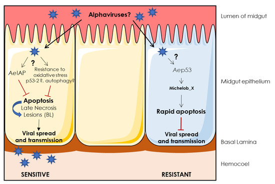 Few studies have been conducted to investigate the interplay between alphaviruses and their vector. However, recent findings in mosquito and drosophila underlie the role of p53 isoforms in cell response to oxidative stress and to DENV infection. The balance between a rapid apoptosis and a delayed, secondary necrosis may explain in part the differences between tolerant and resistant mosquitoes’ strains. For more details see [177,189,190,191,192,193,194,195,196] and Figure 3 for suggested mechanisms which may be involved in alphavirus infection in sensitive versus resistant mosquitoes, extrapolated from other arboviruses.