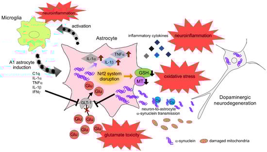 Neuron-astrocyte interaction under neuropathological conditions. Neurotoxic A1 astrocytes, induced by activated microglia, upregulate proinflammatory factors, such as IL-1α, IL-1β and TNF-α and produce neuroinflammation. Microglia-released proinflammatory mediators, such as TNF-α, IL-1β, and IFN-γ, inhibit glutamate uptake in astrocytes leading to glutamate toxicity. Nrf2 system disruption in astrocytes leads to decrease in antioxidative molecules, which results in oxidative stress. Damaged neurons release aggregated α-synuclein and damaged mitochondria. Neuron-to-astrocyte transmission of α-synuclein, followed by its accumulation and deposition in astrocytes, produces proinflammatory cytokines and impairs glutamate uptake via GLT-1.