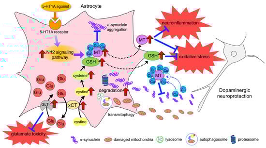 Targeting molecules in astrocytes for dopaminergic neuroprotection. Upregulation of astrocytic xCT increases GSH synthesis leading to neuroprotection against oxidative stress. GLT-1 plays an important role in inhibiting glutamate toxicity. GLT-1 and xCT cooperate for continuous cystine uptake followed by GSH synthesis. MTs bind Cu with a high affinity and inhibit Cu-induced α-synuclein aggregation. The stimulation of 5-HT1A receptor on astrocytes activates the Nrf2 signaling pathway followed by the upregulation of antioxidants including GSH-related molecules and MTs. Astrocytes engulf the aggregated α-synuclein and damaged mitochondria released from neuronal cells and degrade these neuronal waste via the proteasome and autophagy pathways.