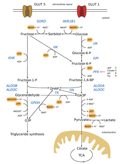 The ingested fructose is mainly metabolized via ketohexokinase (KHK), also known as fructokinase in the liver. KHK phosphorylates fructose to fructose-1-phosphate (F1P), which is then hydrolyzed via aldolase B to dihydroxyacetone phosphate (DHAP) and glyceraldehyde (GA) (Figure 1). Both DHAP and GA can be further metabolized via glycolysis in the form of glyeraldehyde-3-phosphate (GA3P). Furthermore, GA can be metabolized to glycerol, which in turn can be phosphorylated to glycerol-3-phosphate (G3P), which can be utilized for lipid synthesis or transporting reducing equivalents into mitochondria via the glycerol-3-phosphate shuttle [14]. Beyond that, fructose can be phosphorylated via hexokinase (HK) to fructose-6-phosphate (F6P). Entering glycolysis, F6P is phosphorylated to fructose-1,6-bisphosphate (F1,6BP) via phosphofructokinase (PFK). Like F1P, F1,6BP is hydrolyzed via aldolase, but this time in DHAP and GA3P (Figure 1). The advantage of fructose degradation via KHK is to bypass PFK. PFK is the rate-limiting enzyme of glycolysis and is inhibited by high levels of ATP and citrate as well as low pH and low oxygen levels. Besides these two pathways with an initial phosphorylation step, fructose can theoretically also be converted into glucose. The so-called polyol pathway consists of two reversible reactions, with sorbitol as an intermediate (Figure 1). Here, the hydrogenation of fructose to sorbitol is catalyzed by sorbitol dehydrogenase (SORD) oxidizing NADH to NAD+. Subsequently, sorbitol is dehydrogenated to glucose via aldo-keto reductase family 1, member B1 (AKR1B1). This reaction needs NADP+ as a cofactor. Since the direction of a metabolic reaction depends on the metabolic levels of its substrates and products [15], the polyol pathway provides the means to produce fructose from glucose endogenously [16], as it is known in diabetic patients.