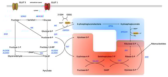 In rapidly dividing cells, such as cancer cells, it has been shown that the pentose phosphate pathway (PPP) is critical to sustain high proliferation rates [62] and that fructose metabolism plays an important role in it [63]. Generally, the PPP has two important cellular functions: (1) to provide metabolic precursors for macromolecule synthesis (ribose 5-phosphate for nucleotide and erythrose 4-phosphate for amino acid biosynthesis) and (2) to provide NADPH for anabolism and redox homeostasis. It can be broken down into two branches: the oxidative and the non-oxidative branch (Figure 2). While the oxidative branch has three irreversible reactions, the non-oxidative branch comprises a series of reversible reactions that connect the PPP to glycolysis.