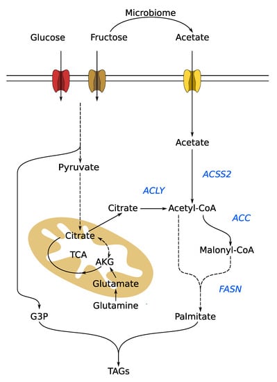 De novo lipogenesis driven by fructose and glucose carbon. Both fructose and glucose can provide carbon for DNL. On the one hand, they can end up in citrate, which is then cleaved by ACLY to provide acetyl-CoA for fatty acid synthesis. On the other hand, they can provide G3P for triacylgyceride synthesis. Besides citrate, cytosolic acetyl-CoA can also be derived from acetate. It was shown that the microbiome of mice converts fructose to acetate. This microbiota-derived acetate is then taken up and utilized for DNL in mice [81]. ACC: acetyl-CoA carboxylase; ACSS2: acyl-coenzyme A synthetase short-chain family member 2; ACLY: ATP citrate lyase; AKG: -ketoglutarate; FASN: fatty acid synthase; G3P: glycerol 3-phosphate; TCA: tricarboxylic acid cycle; TAG: triacylglyceride.