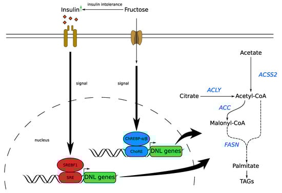 Over the last few years, several research groups have demonstrated that fructose consumption increases DNL [87] and expression levels of the DNL enzymes, ACC [88], FASN [89], and stearoyl CoA desaturase-1 (SCD1) [90]. In fructose-fed rats, it was observed that the expression levels of FASN and SCD1 were significantly increased compared to controls [91]. Similar effects were observed for other lipogenic enzymes [78]. Recently, it was observed that fructose, even at a moderate dose, induces fatty acid synthesis and can enhance tumorigenesis in mice [92]. All this suggests that fructose not only provides carbon for the formation of fatty acids, but also has a signaling function in DNL. However, little is known about the mechanistic role of fructose on DNL enzyme expression. A prominent regulator of DNL is sterol regulatory element-binding protein 1c (SREBF1), which induces many signals for DNL in response to carbohydrate intake [93]. In addition, carbohydrate regulatory element-binding protein (ChREBP) is activated by carbohydrate intake and controls the expression of several lipogenic enzymes [94]. In rat liver, it was observed that nucleus SREBF1 and ChREBP activity increased when dietary glucose is replaced by fructose [95]. The authors showed increased ChREBP binding to ChoRE, a promotor of lipogenic enzymes, and increased active SREBF1 [95]. It has been suggested that hexose-phosphate metabolites are important for ChREBP activation [96,97], highlighting the importance of KHK in the fructose dependent activation of ChREBP. In liver-specific Acly knockout mice consuming a mixture of fructose:glucose, it was observed that ChREBP and DNL gene expression regulation was independent of acetyl-CoA metabolism [81]. The results are in line with experiments showing that KHK knockout mice are protected from fructose-induced fatty liver [98,99].