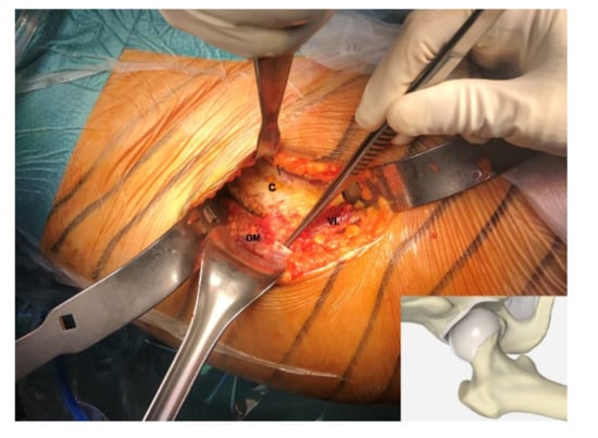 Harvesting a small fragment from the Gluteus Minimus (GM) tendon, indicated by the surgical forceps, during a total hip replacement through an anterior approach. The small fragment is collected at the mid-tendon substance, the white region with the typical structure of the dense regular connective tissue. The hip capsule (C) has been isolated and the Vastus Lateralis (VS) is visible at the bottom of the surgical field.