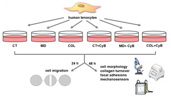 Collagen turnover pathways include collagen breakdown played by MMP-1, which cleaves the intact collagen triple helix, followed by other proteases such as MMP-2 [41,42]. The key role of MMP-1 in tendon ECM homeostasis is based on the previously demonstrated inverse correlation between MMP-1 expression at the gene and protein levels and the amplitude of tensile mechanical load acting on tendons. In fact, low levels of MMP-1 induced by mechanical loading are related to a more stable tendon structure [36]. Here, we show that MMP-1 and MMP-2 levels are not affected by MD and COL, and they remain unchanged by CyB administration. When investigating collagen degradation, TIMPs expression should be also analyzed. TIMP-1 is the main inhibitor of MMP-1, binding MMP-1 in a 1:1 stoichiometric ratio and inhibiting its activation and activity [43,44]. TIMP-1 mRNA levels slightly increased in tenocytes cultured for 48 h on MD and COL, compared to CT, as previously reported [19], and were reduced after CyB administration in all the considered experimental groups. This finding suggests that, in our experimental conditions, TIMP-1 levels are not under specific mechanical control mediated by the actin cytoskeleton. Overall, collagen turnover mechanisms involving the activity of MMP-1, MMP-2 and TIMP-1 seem to be unaffected by CyB.
