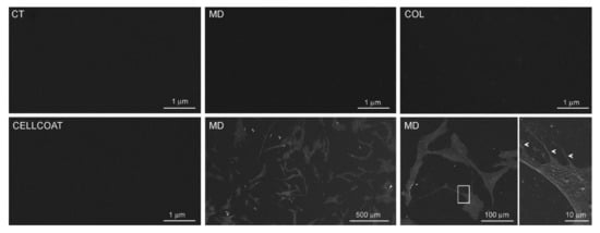 The presence and the characteristics of the coating obtained using MD or COL were analyzed by scanning electron microscopy (SEM). We did not detect collagen fibrils in Petri dishes coated with MD or COL (Figure 3), compared to CT. As a control, we compared MD- and COL-coated Petri dishes with a commercially available Petri dish coated with Type I collagen (CELLCOAT Type I Collagen—Greiner bio-one cod.628950), in which the presence of the coating resulted undetectable at SEM as well (Figure 3).