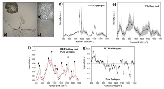 (a) Light microscopy micrograph of MD on calcium fluoride (original magnification 50×). In the insets, the crystal (b) and fibrillary parts (c) at higher magnification (100×) are shown. Raman signals collected from the (d) crystal and (e) fibrillary parts. The gray bands represent the associated standard deviation. (f) Comparison between pure collagen and MD fibrillary part, with peaks of interest highlighted by the black arrows. (g) Subtraction spectrum of MD fibrillary part and pure collagen obtained with the error propagation.