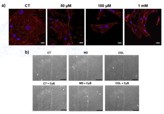 (a) Micrographs showing actin filaments detected by rodhamine-phalloidin by THUNDER in control cells (CT) and after administration of CyB at the indicated doses. After 50 μM CyB, actin filaments become shorter and more evident, indicating that the cytoskeleton is not preserved after CyB. (b) Representative phase contrast microscopy micrographs showing cell morphology of cells grown on MD and COL, compared to CT. After CyB, CT cells become less flattened and more rounded (Figure 4b). Scale bar 200 µm (a) and 20 μm (b).