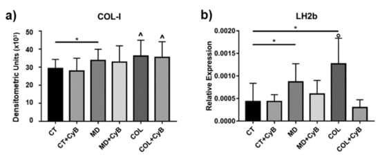 (a) Bar graphs showing COL-I protein levels obtained using slot blot after densitometric scanning of immunoreactive bands in the considered experimental conditions. Data are expressed as mean ± SD. (b) mRNA levels for Long lysyl hydroxylase 2 (LH2b) in CT and tenocytes cultured on MD and COL with or without CyB treatment assessed by real-time PCR. Data were normalized on GAPDH gene expression and are expressed as mean ± SD for at least two independent experiments. * p < 0.05 using t-test. ^ p < 0.05 vs. CT, CT+CyB, COL+CyB vs. CT+CyB; ° p < 0.05 vs. CT and COL+CyB using ANOVA.