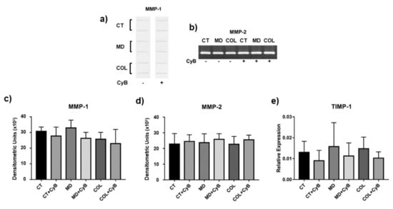 Interstitial collagen degradation is driven by MMP-1. Slot blot analysis of MMP-1 levels in cell culture supernatants revealed that this collagenase remained unaffected in tenocytes cultured on MD and COL, compared to CT, as well as after CyB administration (Figure 7a,c). A similar pattern of expression was observed for MMP-2 gelatinolytic activity, assessed by SDS-zymography (Figure 7b,d). A similar pattern was also observed for TIMP-1, the main inhibitor of MMP-1, analyzed at the gene expression level by real-time PCR. TIMP-1 mRNA levels revealed wide interindividual differences and were similarly modified by CyB in all the experimental groups (Figure 7e).